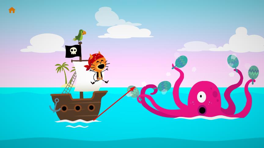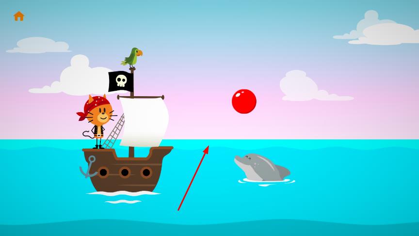 2、進入海洋場景,操控的海盜船在藍色海面上航行,航行過程中會遇到各種海洋生物和物品,通過點擊或滑動屏幕與這些元素互動。