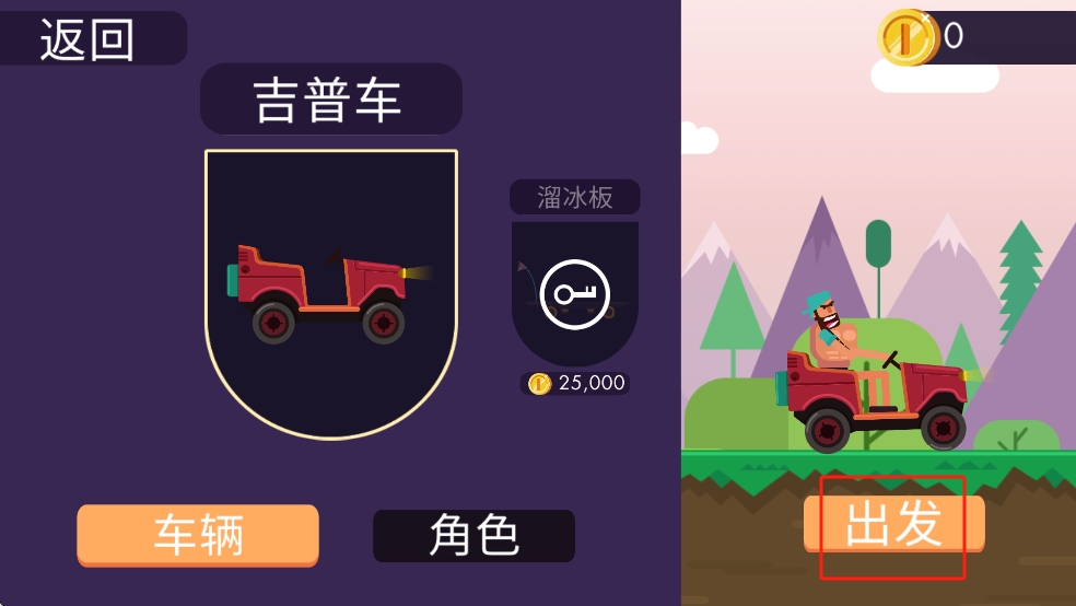 1、在準(zhǔn)備界面,我們選擇好車(chē)輛跟角色,然后點(diǎn)擊右側(cè)的出發(fā)按鈕,進(jìn)入游戲關(guān)卡,準(zhǔn)備駕駛車(chē)輛挑戰(zhàn)地形。