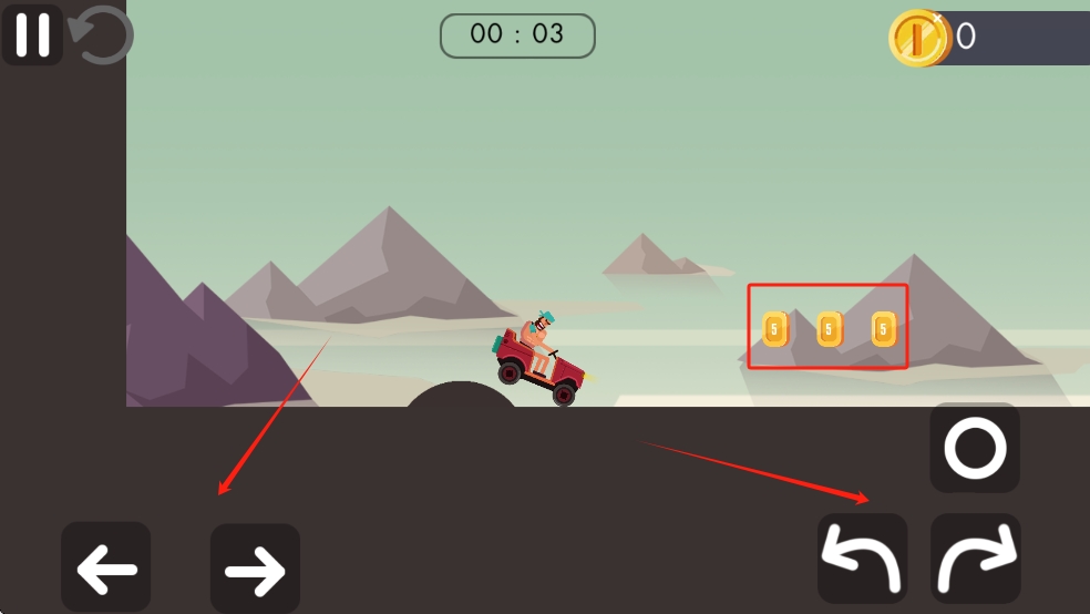 2、駕駛過(guò)程中利用左右方向鍵和轉(zhuǎn)向按鈕控制吉普車(chē),躲避障礙,瞄準(zhǔn)道路上的金幣,盡可能全部收集,積累資源。
