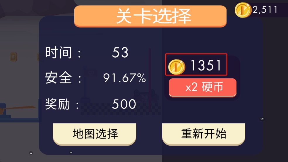 3、闖過(guò)當(dāng)前關(guān)卡后,界面會(huì)顯示本局的時(shí)間、安全率等數(shù)據(jù),若想獲得更多金幣,點(diǎn)擊x2硬幣翻倍獎(jiǎng)勵(lì)。