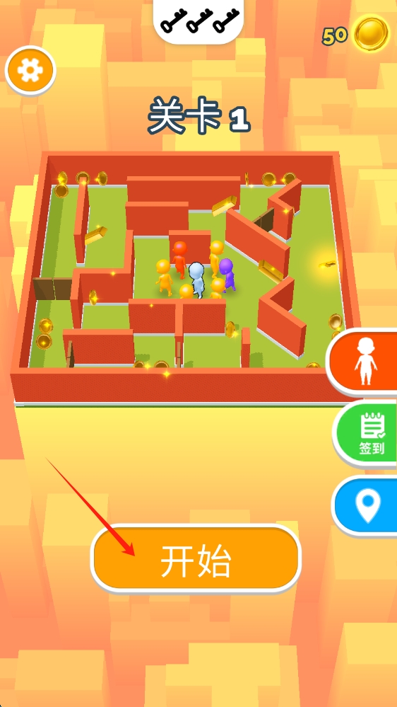 1、點(diǎn)擊開始,進(jìn)入關(guān)卡1迷宮,開啟收集金幣的冒險(xiǎn),準(zhǔn)備應(yīng)對迷宮挑戰(zhàn),點(diǎn)擊按鈕開始游戲。