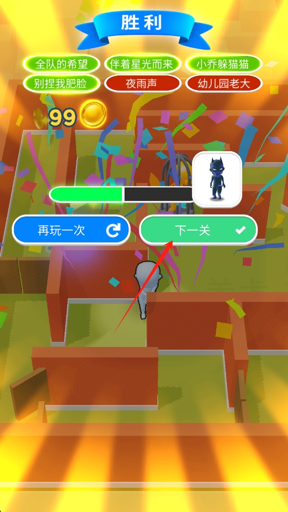 3、勝利后點(diǎn)擊下一關(guān),繼續(xù)新的迷宮挑戰(zhàn),積累更多金幣,提升游戲成就,點(diǎn)擊進(jìn)入到下一關(guān)。