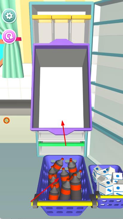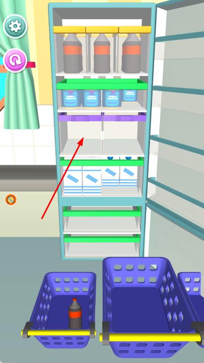 2、將籃子里的物品整理到冰箱的架子上,通過(guò)點(diǎn)擊或拖動(dòng)籃子,將物品放置到冰箱內(nèi)合適的位置。