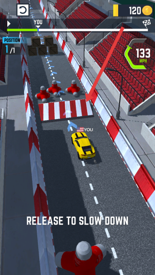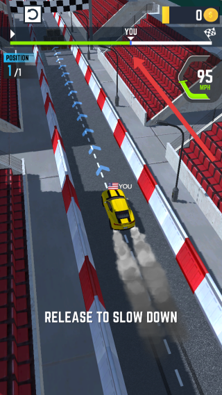1、比賽中長按屏幕保持加速松開RELEASE可減速,借助加速沖刺提升賽道排名,把控速度沖過終點。