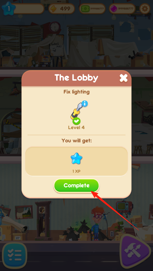 1、點(diǎn)擊Complete完成任務(wù),修復(fù)大堂照明獲取經(jīng)驗(yàn),提升建筑等級(jí),體驗(yàn)任務(wù)結(jié)算機(jī)制。