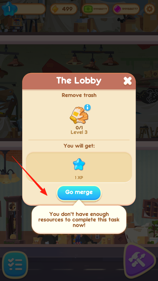 2、點(diǎn)擊Go merge嘗試合并,因資源不足無法完成清理,需收集材料推進(jìn)任務(wù)流程,體驗(yàn)資源限制玩法。