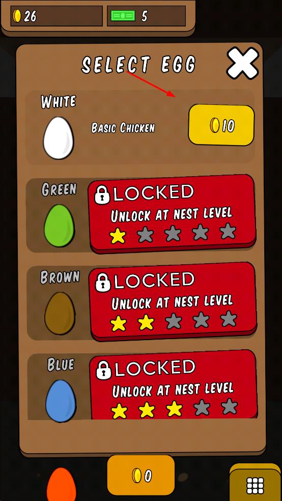 1、在選蛋界面選擇可解鎖的蛋如白色蛋,花費(fèi)10金幣解鎖基礎(chǔ)雞,綠色、棕色、藍(lán)色蛋需達(dá)到一定巢等級后解鎖。