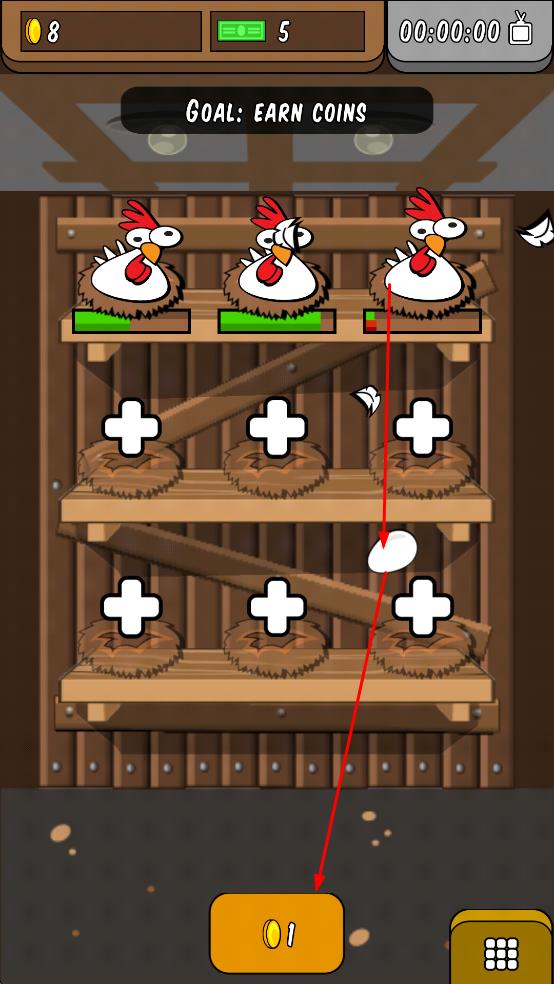 2、目標(biāo)是賺取金幣。通過雞下蛋,點(diǎn)擊收集雞蛋獲取金幣,同時(shí)可利用道具提升產(chǎn)蛋效率,積累更多金幣。