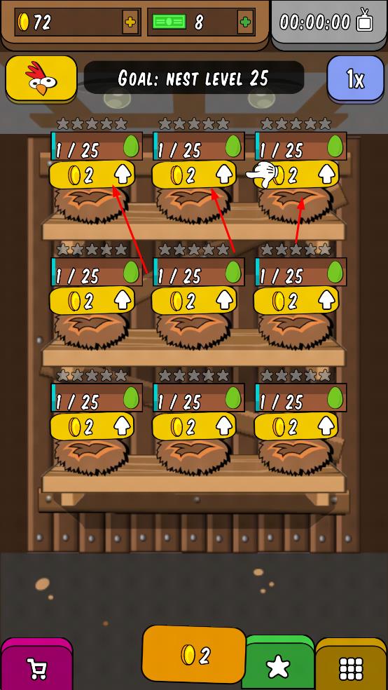3、目標(biāo)為將巢升級到25級,使用賺取的金幣升級巢,每個(gè)巢升級需一定金幣,升級后可提升產(chǎn)蛋能力和獲取更多獎(jiǎng)勵(lì)。