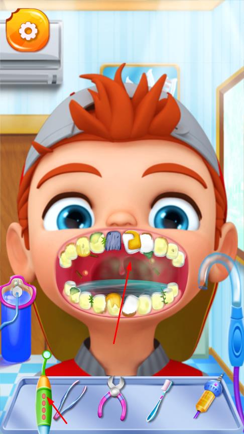 2、點(diǎn)擊托盤中的工具,對(duì)患者的牙齒進(jìn)行檢查和治療,能看到牙齒上存在污垢、蛀牙等問題,使用相應(yīng)的工具進(jìn)行處理。