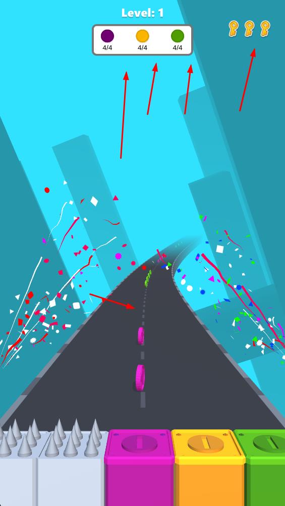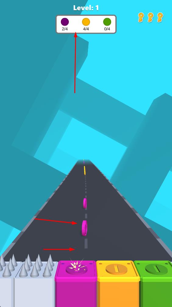 2、注意避開障礙物,同時關(guān)注上方的收集進(jìn)度條,確保每種顏色的硬幣都收集到指定數(shù)量。
