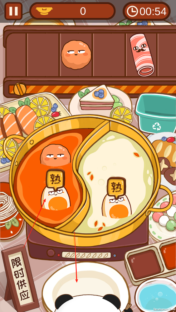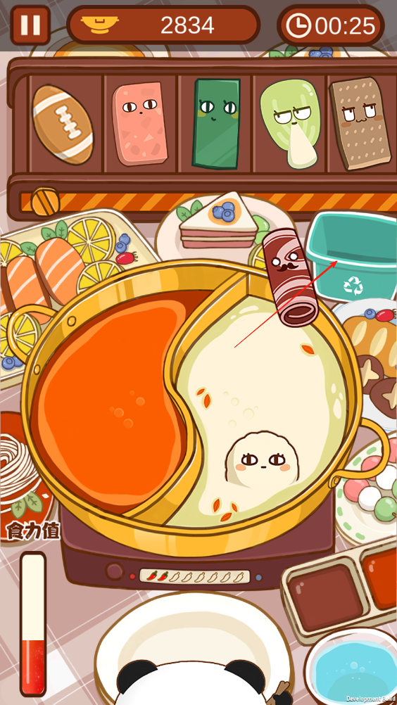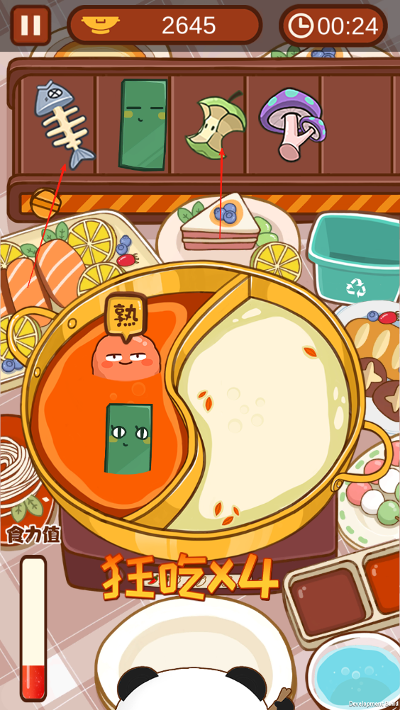 1、上方的傳送帶會不斷傳送食物,我們需要將食物拖動進(jìn)鍋里,當(dāng)食物上方出現(xiàn)熟字時,即可拖動食物到盤子里讓小熊貓吃下。