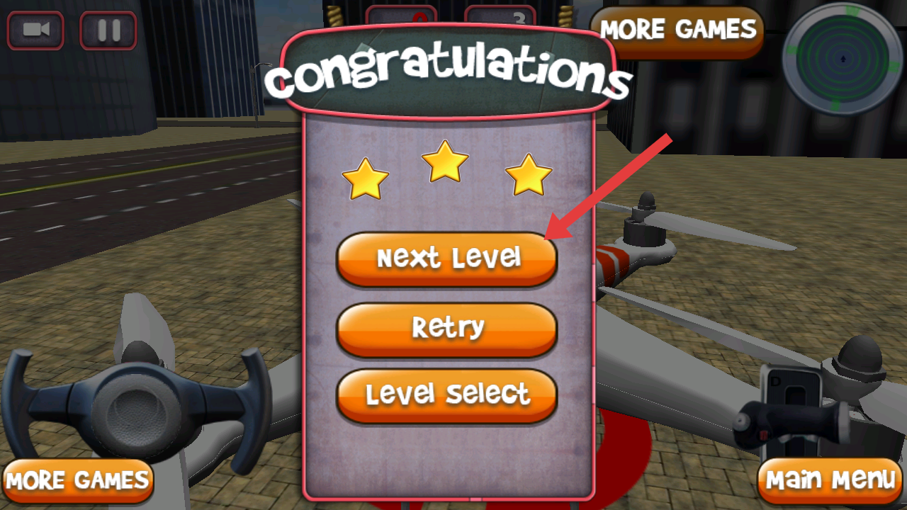 2、在游戲的關卡完成后,需要點擊Next Level的按鈕,進入下一關更有難度的無人機起降挑戰(zhàn)。
