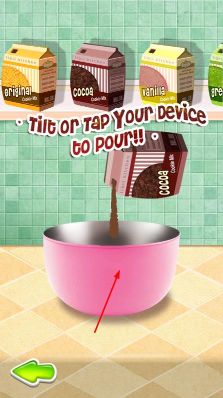 1、進(jìn)入游戲,在制作階段,屏幕上會展示多種曲奇餅干預(yù)拌粉,通過傾斜或點擊設(shè)備,將選中的預(yù)拌粉倒入粉色的碗中。