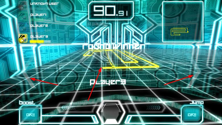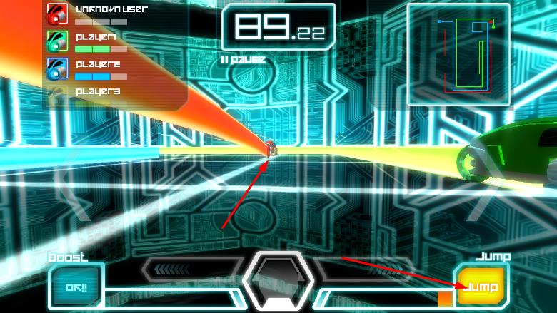 2、右上角顯示當前位置地圖,通過屏幕下方的boost和Jump按鈕,控制光線單車的加速和跳躍。
