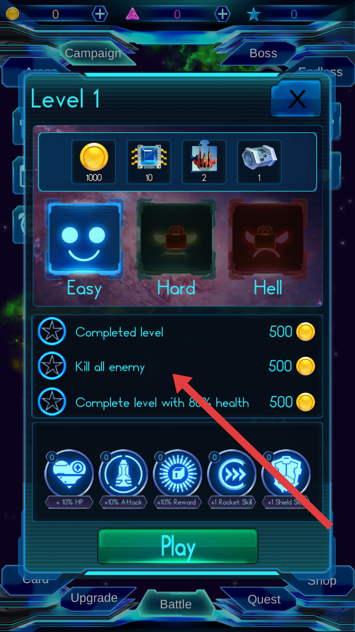 1、進(jìn)入Level1關(guān)卡,明確該關(guān)卡的Kill all enemy等任務(wù)目標(biāo),選擇難度后點(diǎn)擊Play開(kāi)始戰(zhàn)斗。