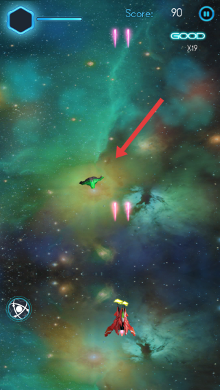 2、開(kāi)局進(jìn)入需要操控紅色的戰(zhàn)機(jī),瞄準(zhǔn)并攻擊前方綠色敵機(jī),還需要小心的躲避敵方火力攻擊。