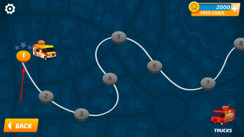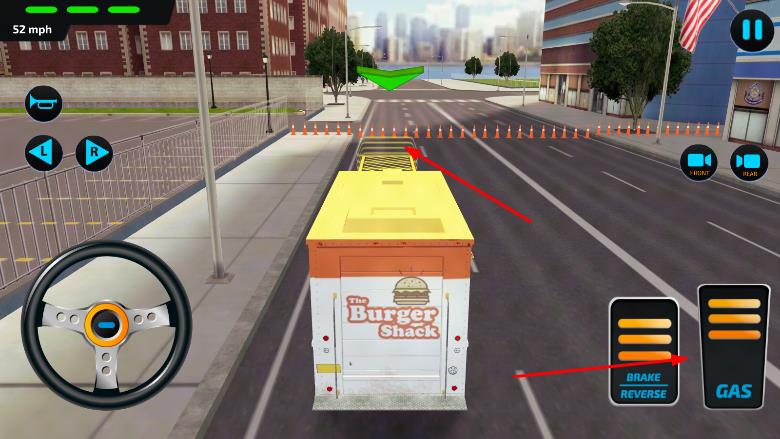 1、進(jìn)入游戲,在關(guān)卡選擇界面,選擇關(guān)卡1,進(jìn)入駕駛場景后,通過屏幕中的方向盤控制餐車方向,點(diǎn)擊GAS按鈕加速,BRAKE按鈕剎車或倒車。