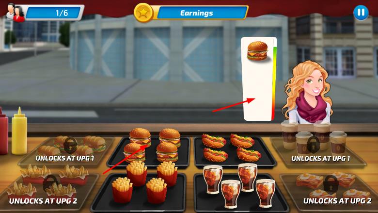 3、根據(jù)顧客需求,在餐車操作臺界面,選擇對應(yīng)的食物遞給顧客,上方顯示訂單進(jìn)度,要在顧客耐心值耗盡前完成訂單。