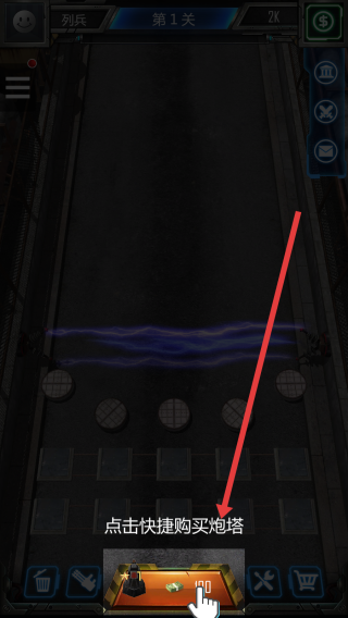 1、在第1關(guān)界面,按照屏幕中的提示,點擊快捷購買炮塔按鈕,消耗金幣獲取新炮塔,為戰(zhàn)斗做準(zhǔn)備。