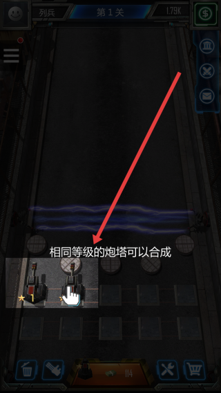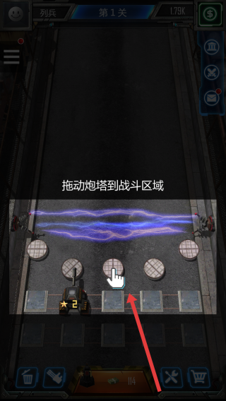 3、根據(jù)紅色箭頭的指引,把合成后的炮塔拖到戰(zhàn)斗區(qū)域的空位,布置防御,守護路徑抵御敵方進攻。