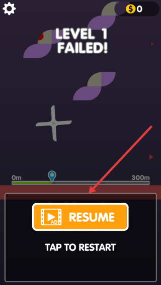 3、Level1失敗,可點(diǎn)TAP TO RESTART重啟,或看廣告點(diǎn)RESUME續(xù)關(guān),調(diào)整操作再闖軌道。