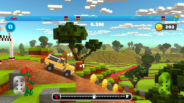 2、駕駛黃色越野車收集路邊金幣,爬坡時(shí)通過(guò)右側(cè)綠色油門按鍵控制動(dòng)力,留意底部油量表。