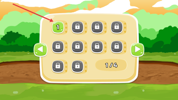 1、點(diǎn)擊首屏綠色播放按鈕,進(jìn)入關(guān)卡選擇頁(yè),選亮著的1號(hào)關(guān)卡,借叢林背景開啟火柴人冒險(xiǎn),準(zhǔn)備挑戰(zhàn)首關(guān)。