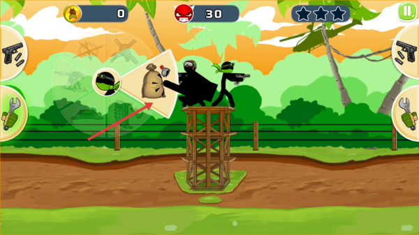 2、第1關(guān)場(chǎng)景,操控火柴人小隊(duì)站木塔,按指引選錢袋道具,搭配武器,瞄準(zhǔn)下方敵人,借地形發(fā)起攻擊推進(jìn)。