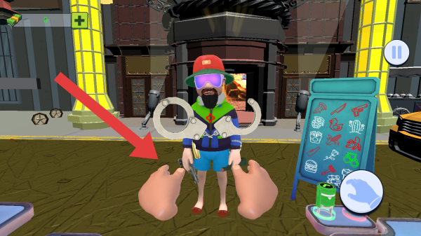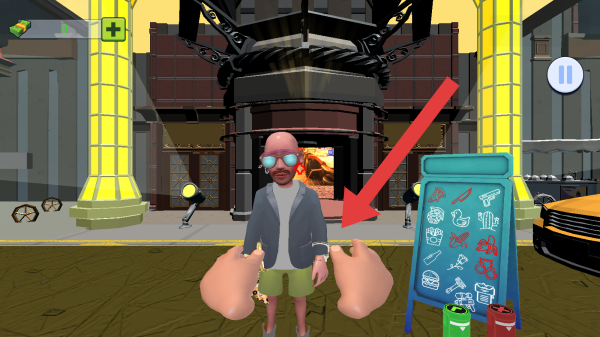 2、呈現(xiàn)玩家視角、一名戴眼鏡穿休閑裝的人物、旁邊的展示板、建筑及車輛等場景元素,是在游戲中進(jìn)行互動操作環(huán)節(jié)。