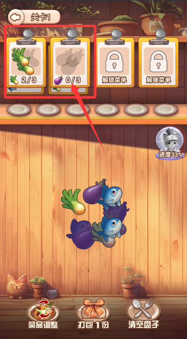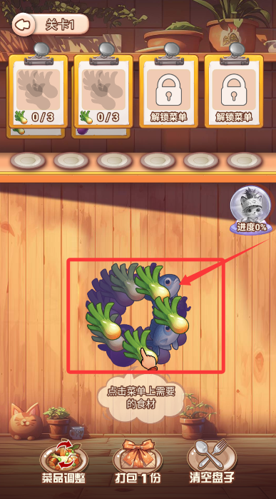 1、先查看頂部任務(wù)欄的食材需求,從底部的食材庫(kù)中挑選匹配的原料。