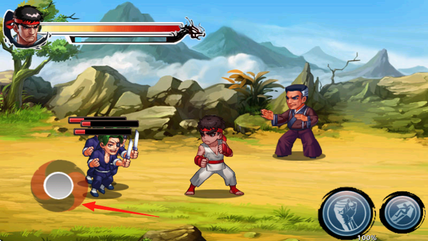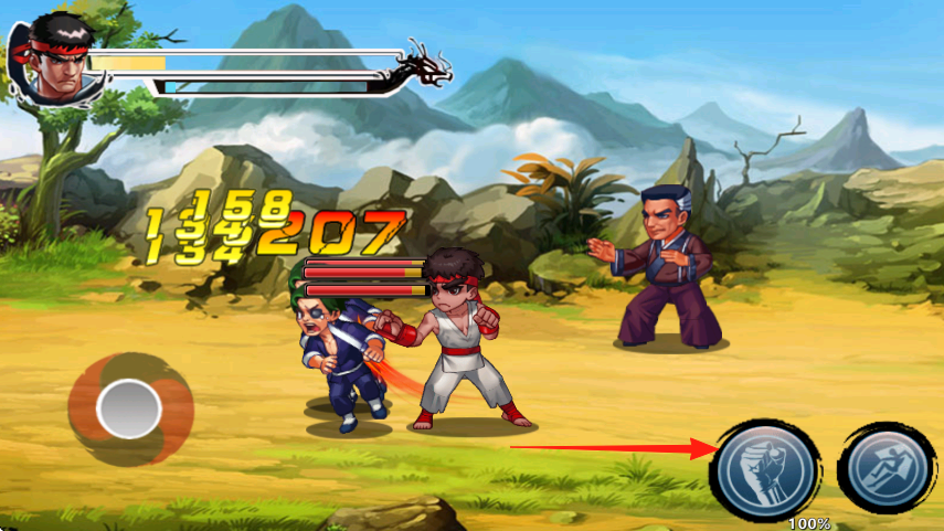 1、操控角色移動,在遇敵時,點(diǎn)擊紅箭頭指向的技能按鈕,釋放招式攻擊敵人。