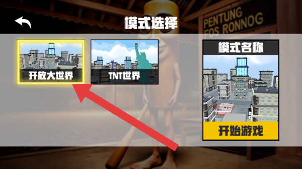 1、畫(huà)面呈現(xiàn)兩種模式的選擇,有開(kāi)發(fā)大世界、TNT世界,可選擇第一種后再點(diǎn)擊開(kāi)始游戲進(jìn)入。