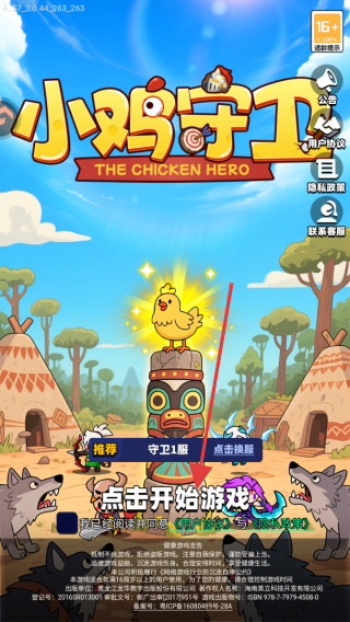 1、這是一款名為小雞守衛(wèi)THE CHICKEN HERO的游戲,在初始界面,點擊點擊開始游戲按鈕,即可進入游戲開始你的冒險。