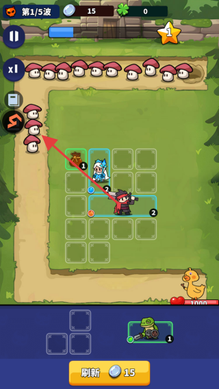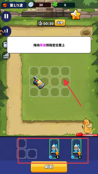 2、在游戲第1/5波中,界面提示拖動英雄到指定位置上,你需要將下方的英雄角色拖動到上方的網(wǎng)格位置,布置防御來抵御敵人。