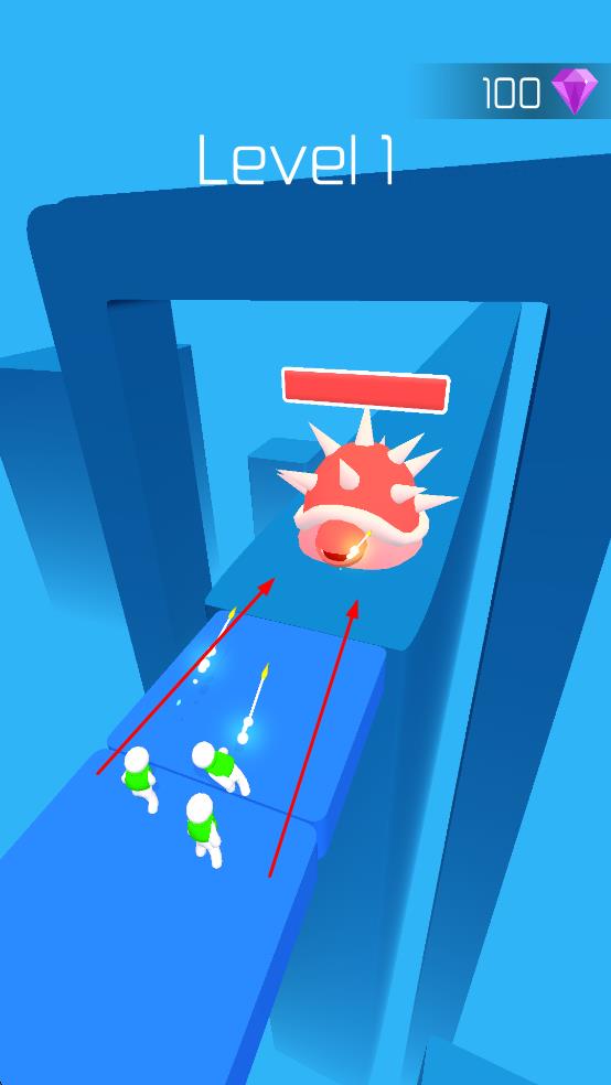 3、抵達(dá)BOSS區(qū)域后,指揮小人隊(duì)伍向紅色尖刺BOSS發(fā)起攻擊,消耗其血量,成功擊敗BOSS即可通關(guān)關(guān)卡。