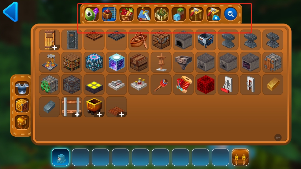 3、打開物品欄,點擊上方紅色框的分類圖標,切換類別快速查找工具、資源或裝飾物品,輔助建造與采集。