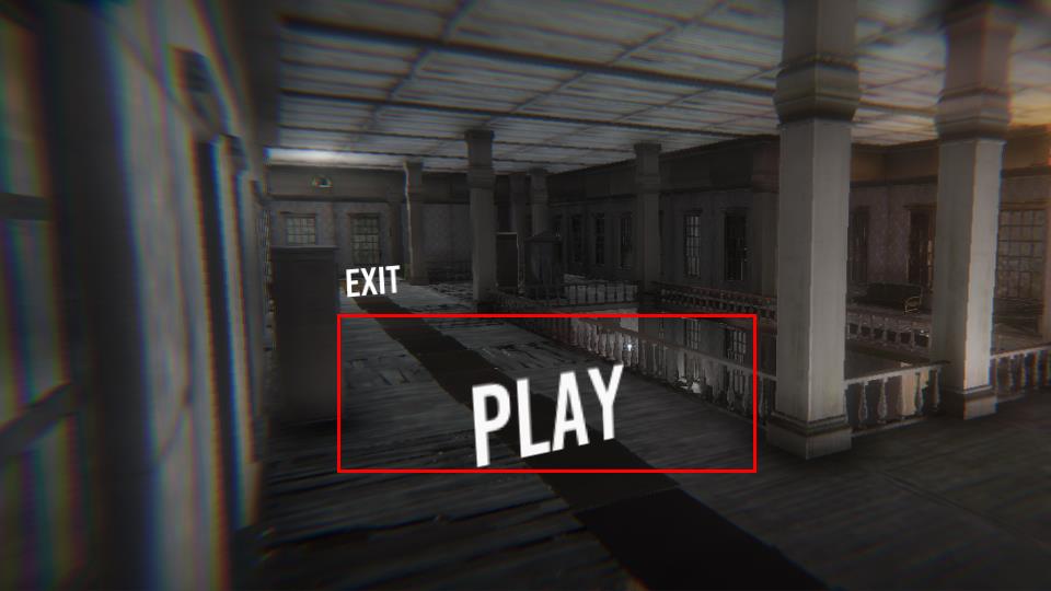 1、進(jìn)入初始界面,點(diǎn)擊中間紅色框標(biāo)注的PLAY按鈕,正式踏入陰森建筑場(chǎng)景,若暫離可點(diǎn)擊左側(cè)EXIT退出,回歸時(shí)重新啟動(dòng)探索流程。