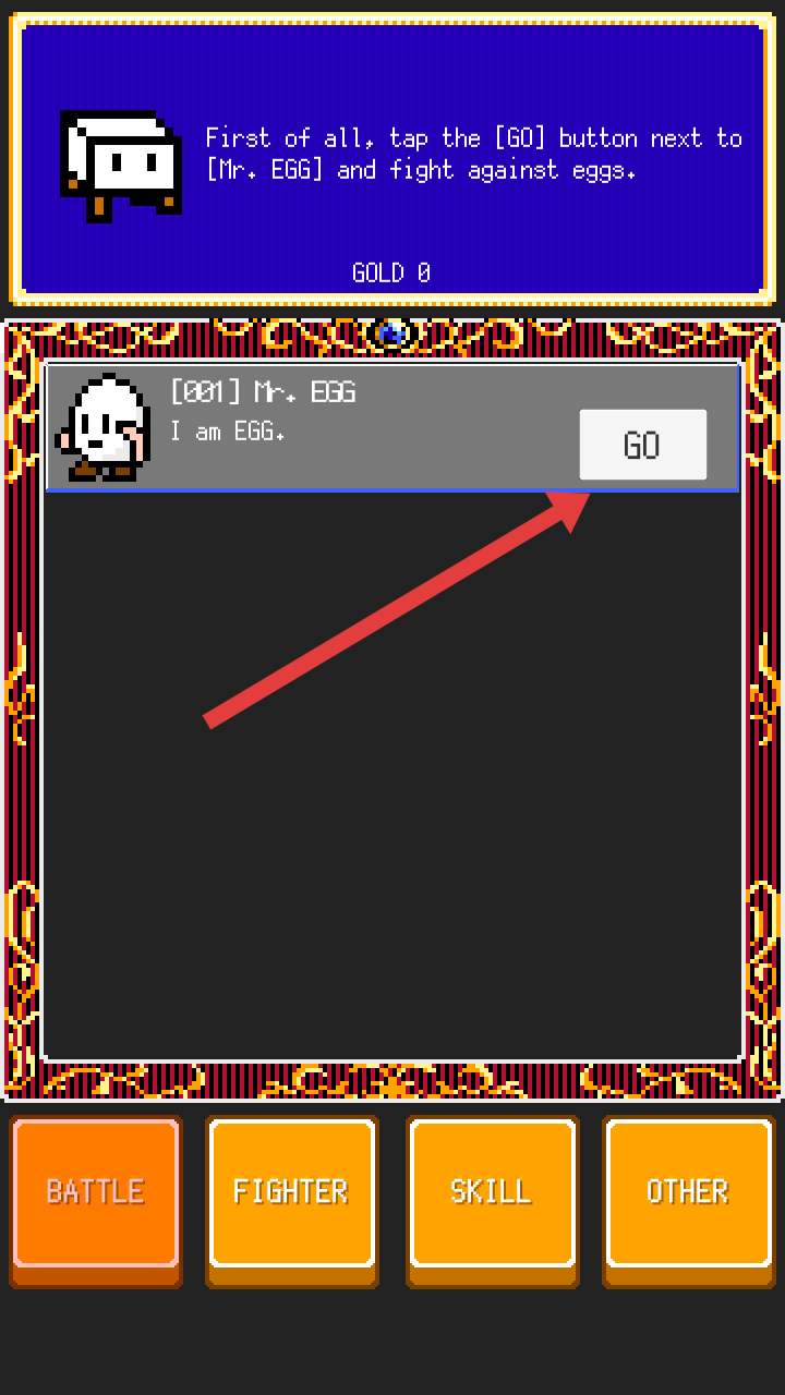 1、進(jìn)入豆腐幻想史的游戲后,需要點(diǎn)擊Mr.EGG右側(cè)的GO按鈕,開(kāi)啟與其他的蛋形敵人戰(zhàn)斗冒險(xiǎn)。