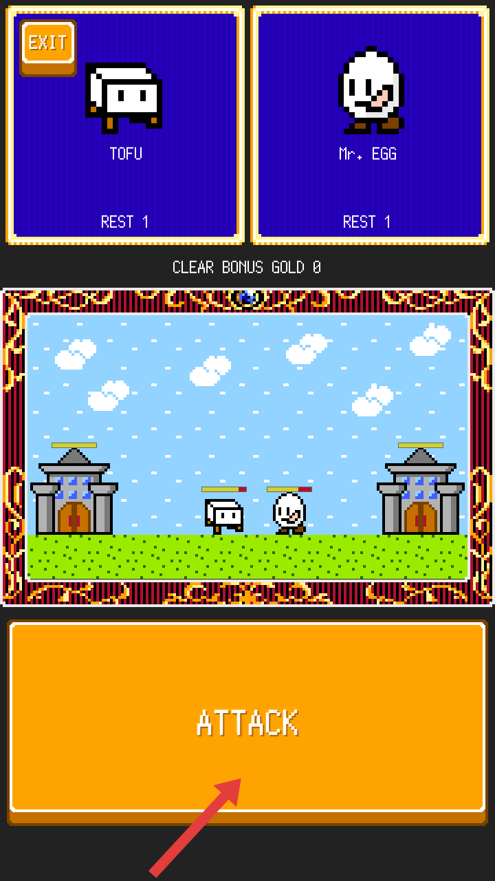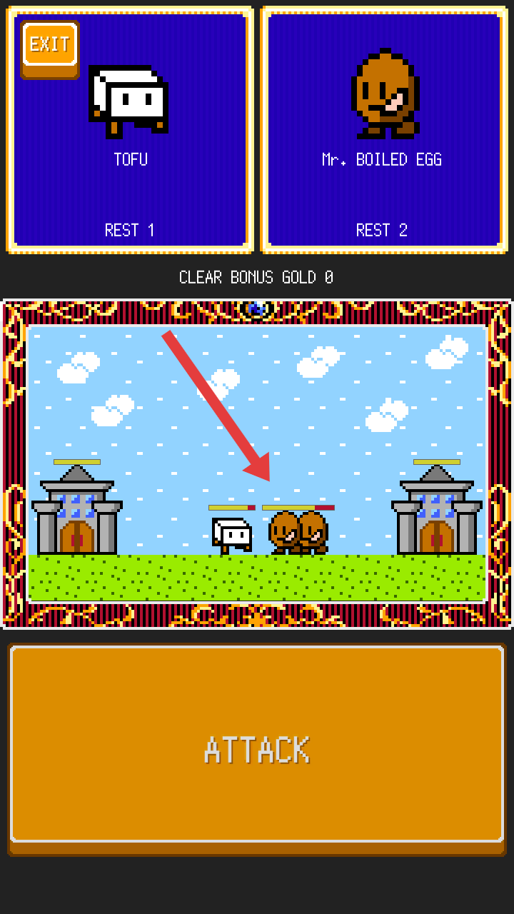 2、進(jìn)入游戲戰(zhàn)斗的界面,需要點(diǎn)擊下方橙色的ATTACK按鈕,指揮TOFU對(duì)Mr.EGG發(fā)起攻擊。