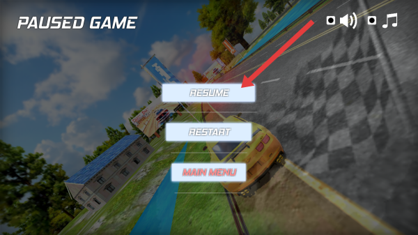 3、若是暫停了游戲,可以點(diǎn)擊界面中RESUME按鈕,恢復(fù)賽車比賽進(jìn)程,繼續(xù)完成競速的挑戰(zhàn)。
