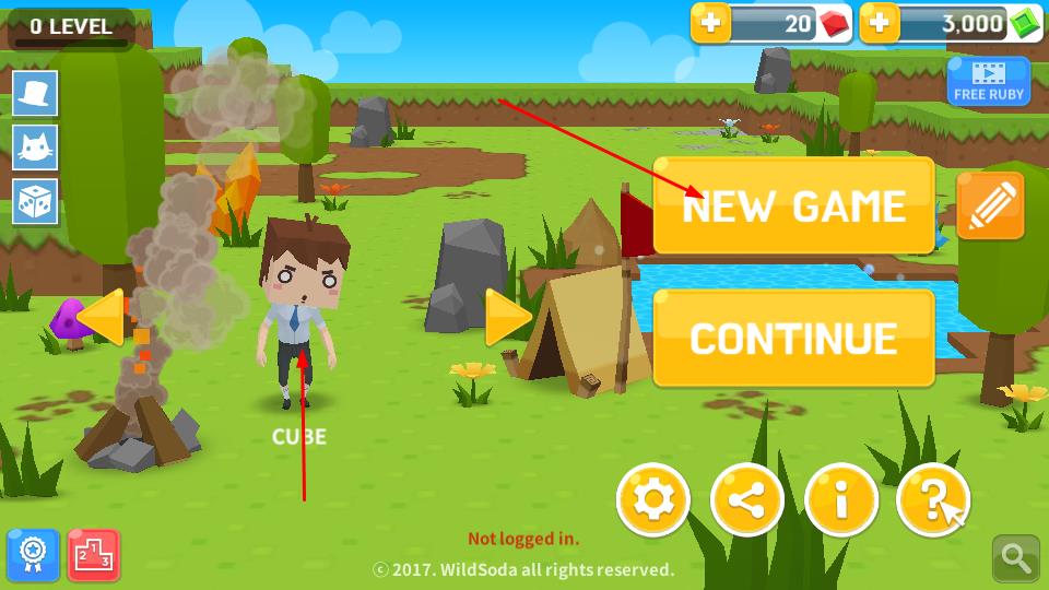 1、點(diǎn)擊黃色NEW GAME按鈕開啟全新冒險(xiǎn),或選CONTINUE延續(xù)進(jìn)度,操控立方造型角色踏入草地場(chǎng)景,開啟生存挑戰(zhàn)流程。