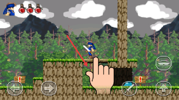 2、森林場景有山、樹、懸崖,按指引長按屏幕讓角色跳躍,跨越草皮覆蓋的斷層,繼續(xù)推進(jìn)Level1探索。