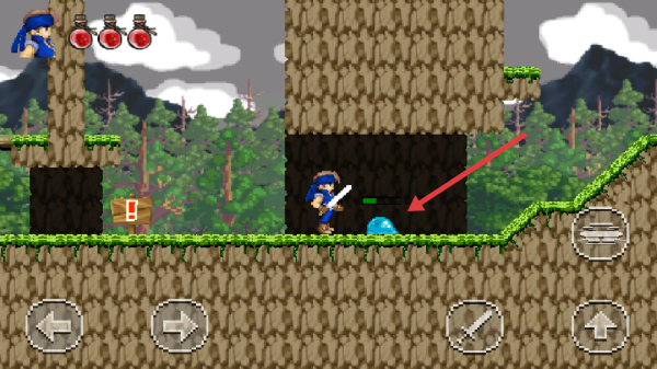 3、前行遇藍(lán)色史萊姆敵人,點(diǎn)擊攻擊鍵或自動攻擊,用劍消滅怪物,沿綠草路徑向更深處關(guān)卡推進(jìn)。