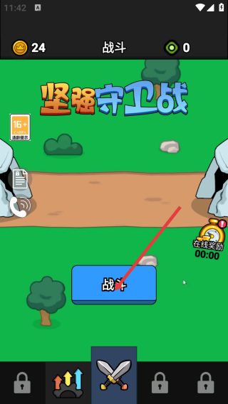 1、進入游戲的主界面,點擊戰(zhàn)斗的按鈕開啟第一個關卡,準備布置防御,抵御從洞穴出現(xiàn)的敵人。