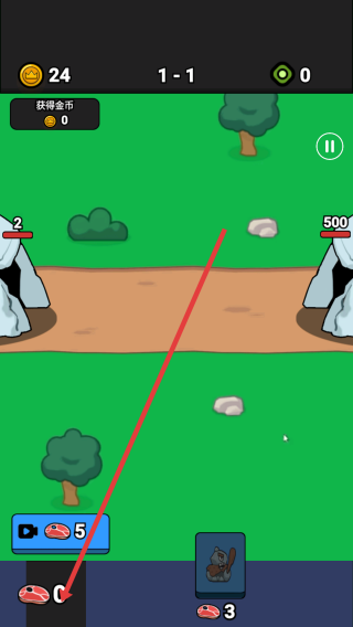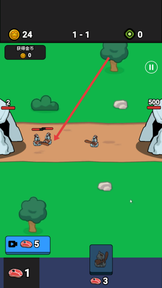 2、在第一個關卡中,觀察敵人從兩側洞穴出兵,點擊下方的卡牌消耗肉塊召喚防御單位,阻攔敵人前行。
