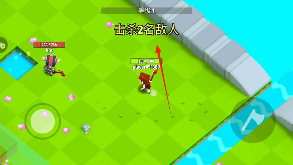 2、發(fā)現(xiàn)敵人bot紅箭頭指向,靠近并點(diǎn)擊攻擊按鈕右側(cè)斧頭圖標(biāo),用武器攻擊。