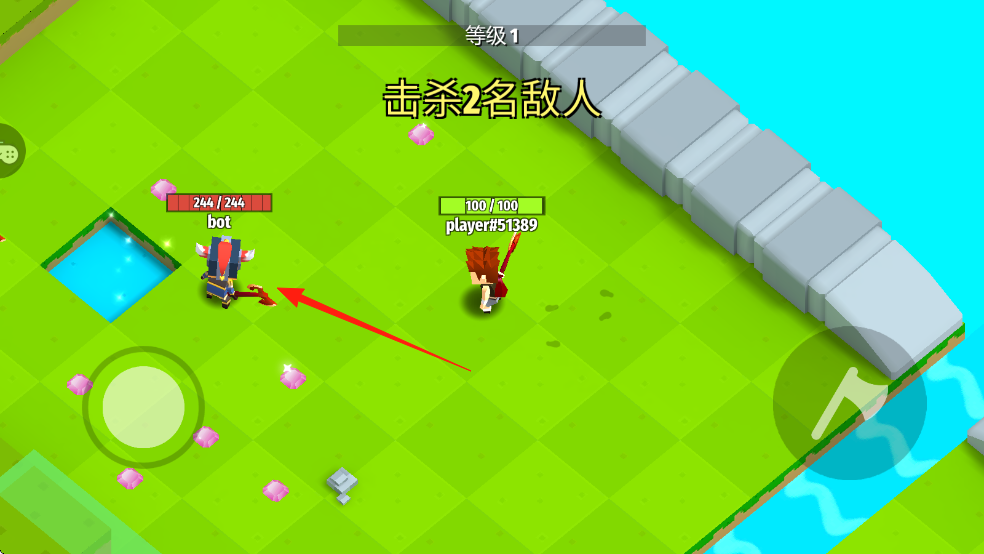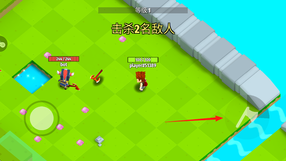 1、進(jìn)入等級1,目標(biāo)擊殺2名敵人,操控角色player#51389,朝紅箭頭方向移動找敵人。