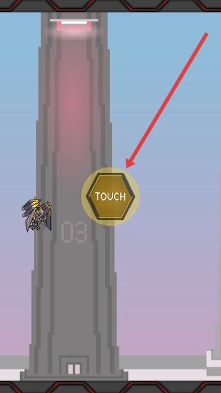 1、按照箭頭方向點(diǎn)擊畫面中金色TOUCH按鈕,觸發(fā)游戲機(jī)制,使角色進(jìn)入平臺跳躍挑戰(zhàn)階段。