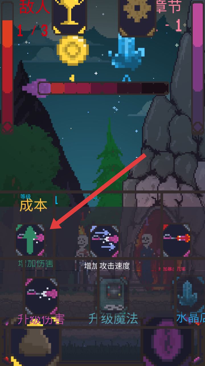 1、在升級界面中,點擊左側(cè)標有增加傷害圖標,提升角色對敵人的輸出能力,為應對更多敵人筑牢攻擊基礎。